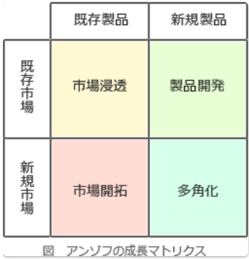 ==アンゾフの成長マトリクス==:経営学者のH・イゴール・アンゾフ(H. Igor Ansoff)が提唱したもので、縦軸に「市場」、横軸に「製品」をとり、それぞれに「既存」「新規」の2区分を設け、4象限(市場浸透,製品開発,市場開拓,多角化)のマトリクスとしたものです。事業が成長・発展できる経営戦略を検討するために適したフレームワークです。