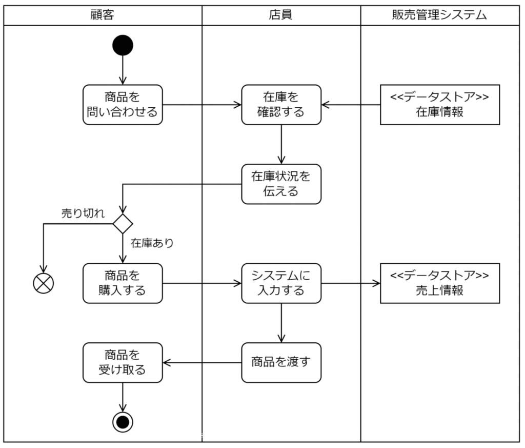 ==アクティビティ図==:ビジネスプロセスの流れやプログラムの制御フローのような一連の手続きを可視化できる図です。