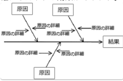 特性要因図(とくせいよういんず)は、現れた特性(結果)とそれに影響を及ぼしたと思われる要因の関係を体系的に表わした図です。直接的な原因と間接的な原因に分別したり、真の問題点を明確にしたりする効果があります。
