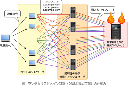ランダムサブドメイン攻撃は、脆弱性のある公開キャッシュサーバ(オープンリゾルバ)や欠陥を持つホームルータに対して、実際には存在しない幾つものサブドメインに対するDNSクエリを発行することで、権威DNSサーバへの問合せを意図的に大量発生させる攻撃です。この攻撃を受けた権威DNSサーバは、過負荷状態となりサーバダウンやサービス停止に陥ってしまう可能性があります。権威DNSサーバがダウンすると、管理下のドメインの名前解決ができなくなるため多数のWebサイトの利用に影響を与えます。