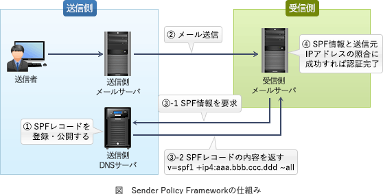 SPF(Sender Policy Framework):SMTP接続してきたメールサーバのIPアドレスをもとに、正規のサーバから送られた電子メールかどうかを検証する技術です。受信メールサーバ側にて電子メールの送信元ドメインが詐称されていないかを検査できます。